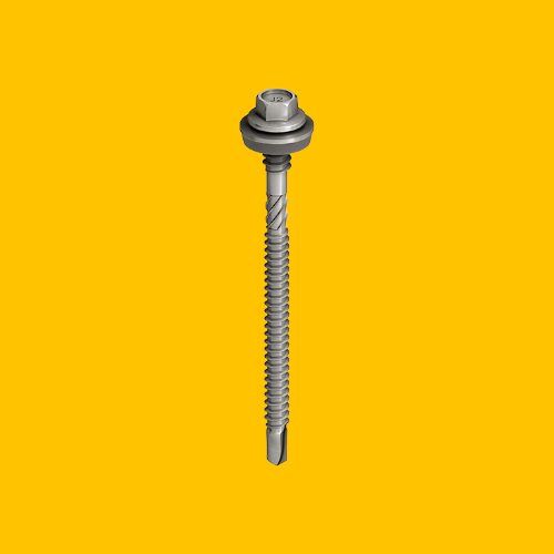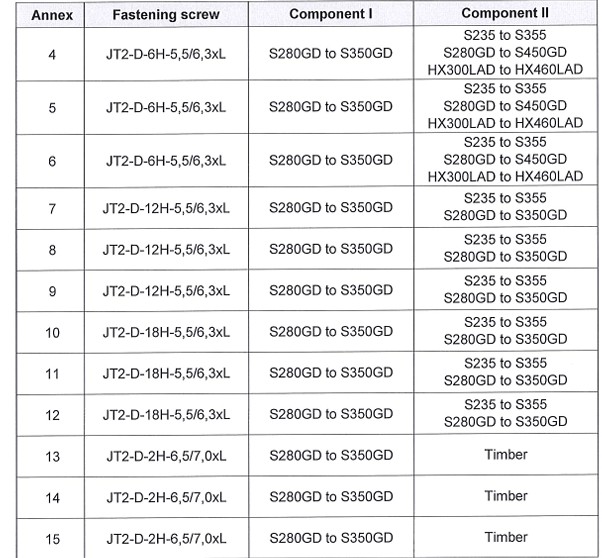 Los tornillos de sujeción son tornillos autoperforantes o autorroscantes fabricados en acero inoxidable austenítico o acero al carbono con recubrimiento anticorrosivo (enumerados en la Tabla 1). Los tornillos de sujeción se completan con arandelas de sellado que constan de una arandela metálica y un sello de EPDM.