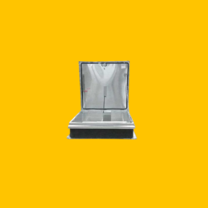 Cubierta: Se abre fácilmente a 90 grados, acabado natural de aluminio .090 en el exterior con revestimiento interior de aluminio .063 y aislamiento de fibra de vidrio de 1″. (El modelo RD-1 utiliza aislamiento de espuma de poliestireno de 1″).